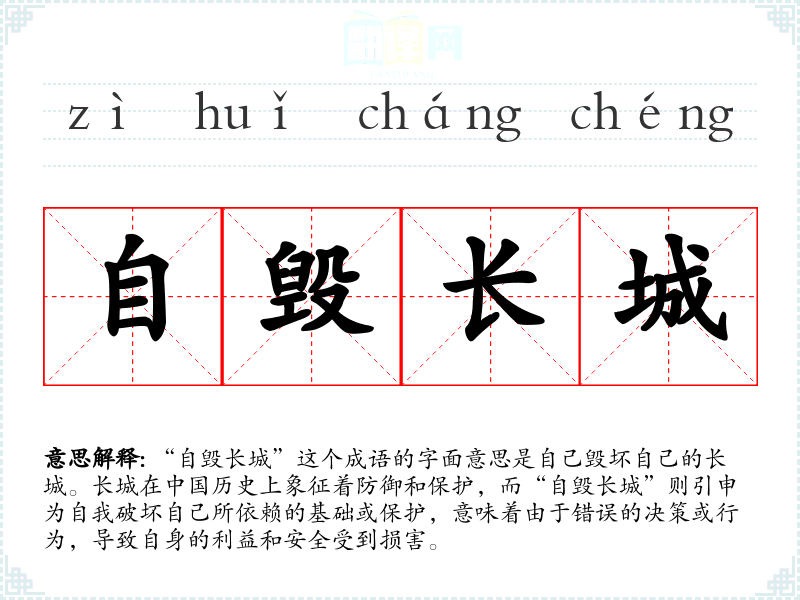 “自毁长城”这个成语的字面意思是自己毁坏自己的长城。长城在**历史上象征着防御和保护,而“自毁长城”则引申为自我破坏自己所依赖的基础或保护,意味着由于错误的决策或行为,导致自身的利益和安全受到损害。
