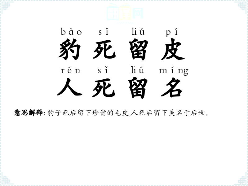 豹子死后留下珍贵的毛皮,人死后留下美名于后世。 |