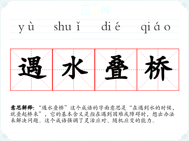 “遇水叠桥”这个成语的字面意思是“在遇到水的时候,就叠起桥来”,它的基本含义是指在遇到困难或障碍时,想出办法来解决问题。这个成语强调了灵活应对、随机应变的能力。