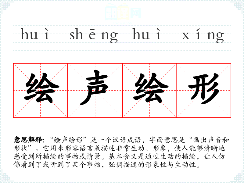 “绘声绘形”最早出现在近现代的文献中,虽然具体出处不详,但它的构成字面上来看,结合了“绘声”(即描绘声音)和“绘形”(即描绘形状),反映了古代绘画艺术与口头表达的结合。传统文化中,艺术常常通过绘画、音乐等形式表现出来,因此这个成语也反映了文化中对形象性表达的重视。