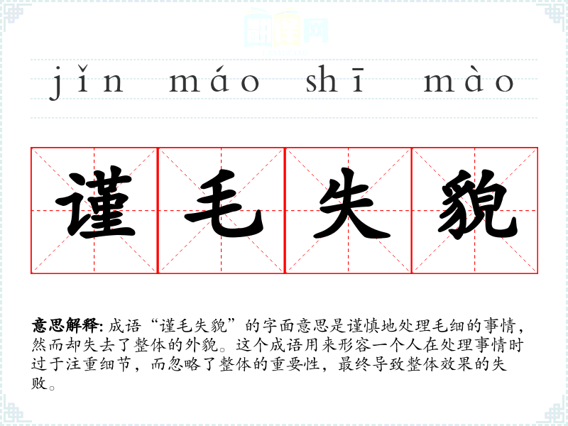 成语“谨毛失貌”的字面意思是谨慎地处理毛细的事情,然而却失去了整体的外貌。这个成语用来形容一个人在处理事情时过于注重细节,而忽略了整体的重要性,最终导致整体效果的失败。
