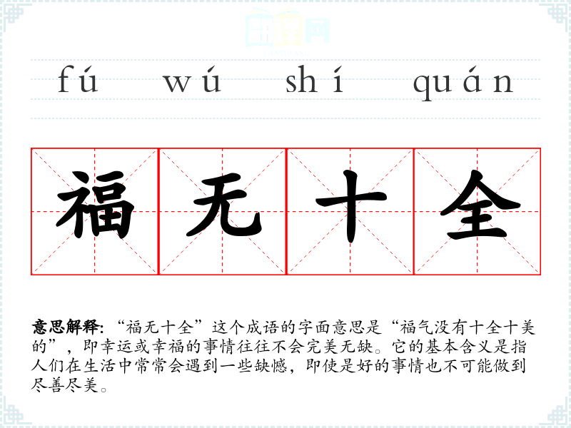 “福无十全”出自《红楼梦》中,书中提到“福无十全,祸不单行”,意指人生中的幸福和不幸往往是相互交织的。这一成语反映了人们对生活中幸福和不幸的辩证看法,强调了人生的不完美。