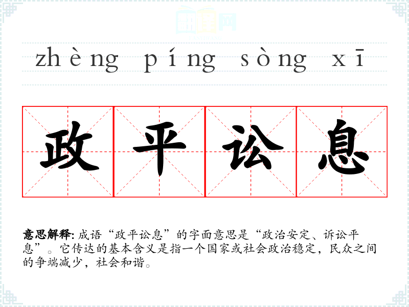 | 政平讼息 | 政平:政治安定;讼息:官司得到调解。国家安定,官司很快得到正确处理。形容政治清明。 |