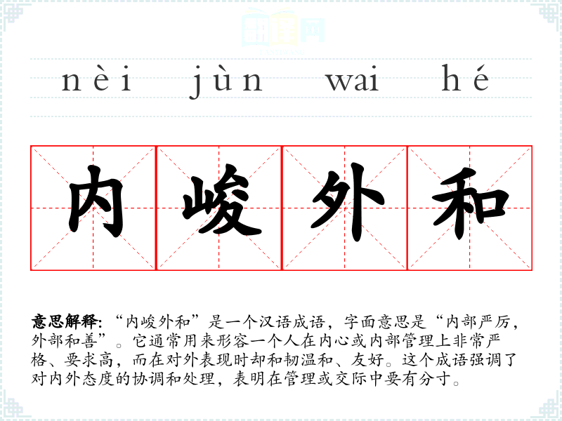 “内峻外和”是一个汉语成语,字面意思是“内部严厉,外部和善”。它通常用来形容一个人在内心或内部管理上非常严格、要求高,而在对外表现时却和韧温和、友好。这个成语强调了对内外态度的协调和处理,表明在管理或交际中要有分寸。