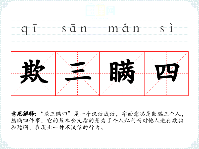 “欺三瞒四”是一个汉语成语,字面意思是欺骗三个人,隐瞒四件事。它的基本含义指的是为了****而对他人进行欺骗和隐瞒,表现出一种不诚信的行为。