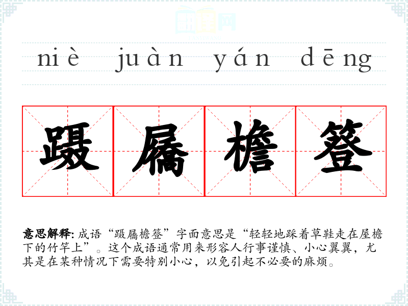 成语“蹑屩檐簦”字面意思是“轻轻地踩着草鞋走在屋檐下的竹竿上”。这个成语通常用来形容人行事谨慎、小心翼翼,尤其是在某种情况下需要特别小心,以免引起不必要的麻烦。
