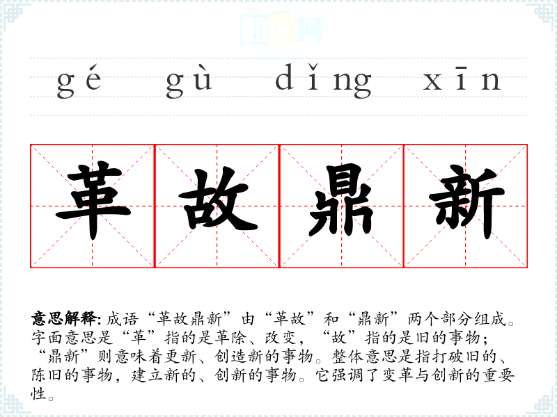 成语“革故鼎新”由“革故”和“鼎新”两个部分组成。字面意思是“革”指的是革除、改变,“故”指的是旧的事物;“鼎新”则意味着更新、创造新的事物。整体意思是指打破旧的、陈旧的事物,建立新的、创新的事物。它强调了变革与创新的重要性。