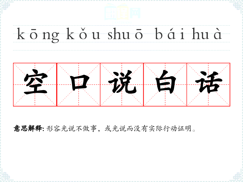 | 空口白话 | 形容只说不实行,或只说而没有事实证明。 |
