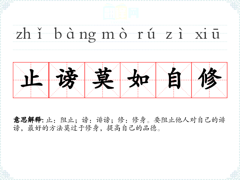 | 止谤莫若自修 | 止:停止,平息;谤:指责。要阻止别人毁谤,最好的方法是修身 |