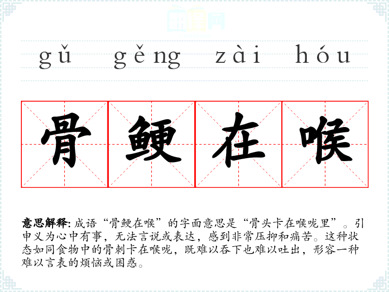 | 如鲠在喉 | 鱼骨头卡在喉咙里。比喻心里有话没有说出来,非常难受。 |