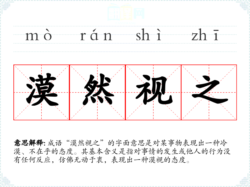 “漠然视之”的来源并不明确,但其构成的词汇“漠然”意指冷淡、无情,而“视之”则是“看待”的意思。可以理解为在古代文学中,常常用来形容对某些社会现象或人际关系的冷漠态度。此成语在古文和现代汉语中都有使用,反映了一种对外界事物的消极态度。