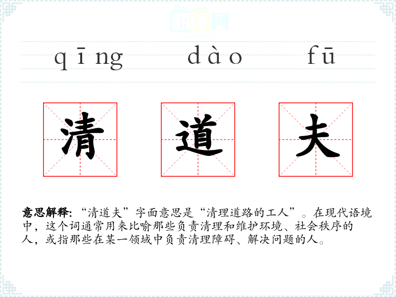 “清道夫”字面意思是“清理道路的工人”。在现代语境中,这个词通常用来比喻那些负责清理和维护环境、社会秩序的人,或指那些在某一领域中负责清理障碍、解决问题的人。