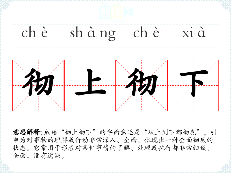 成语“彻上彻下”的字面意思是“从上到下都彻底”,引申为对事物的理解或行动非常深入、全面,体现出一种全面彻底的状态。它常用于形容对某件事情的了解、处理或执行都非常细致、全面,没有遗漏。