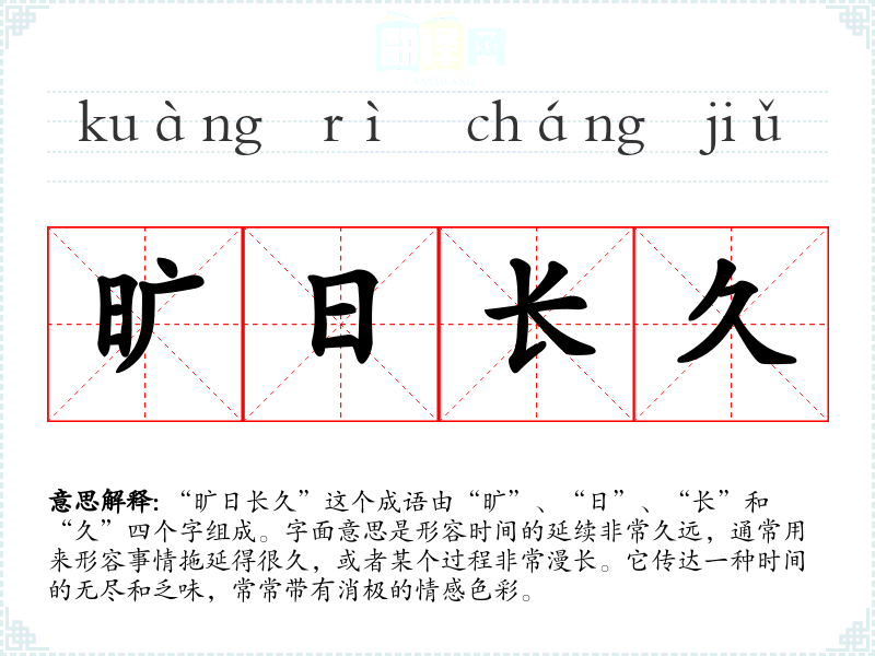 “旷日长久”这个成语由“旷”、“日”、“长”和“久”四个字组成。字面意思是形容时间的延续非常久远,通常用来形容事情拖延得很久,或者某个过程非常漫长。它传达一种时间的无尽和乏味,常常带有消极的情感色彩。