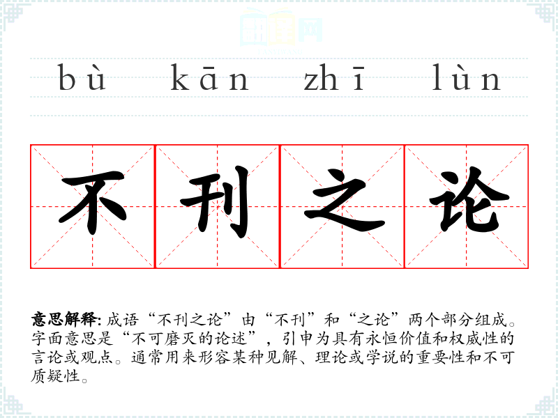 成语“不刊之论”由“不刊”和“之论”两个部分组成。字面意思是“不可磨灭的论述”,引申为具有永恒价值和权威性的言论或观点。通常用来形容某种见解、理论或学说的重要性和不可质疑性。