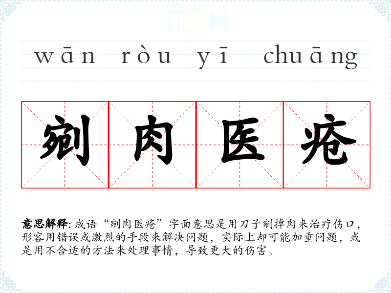 成语“剜肉医疮”字面意思是用刀子剜掉肉来治疗伤口,形容用错误或激烈的手段来解决问题,实际上却可能加重问题,或是用不合适的方法来处理事情,导致更大的伤害。