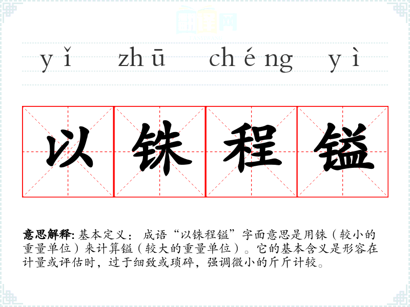 基本定义: 成语“以铢程镒”字面意思是用铢(较小的重量单位)来计算镒(较大的重量单位)。它的基本含义是形容在计量或评估时,过于细致或琐碎,强调微小的斤斤计较。