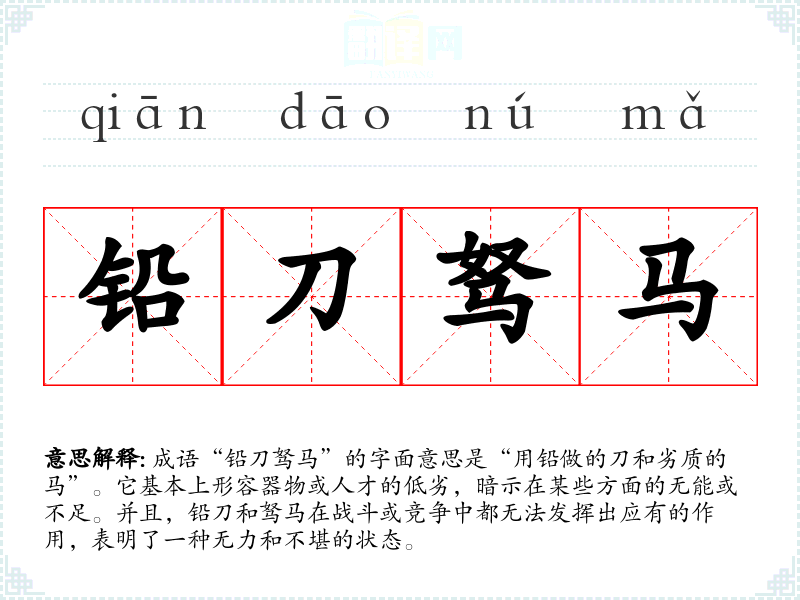 成语“铅刀驽马”的字面意思是“用铅做的刀和劣质的马”。它基本上形容器物或人才的低劣,暗示在某些方面的无能或不足。并且,铅刀和驽马在战斗或竞争中都无法发挥出应有的作用,表明了一种无力和不堪的状态。