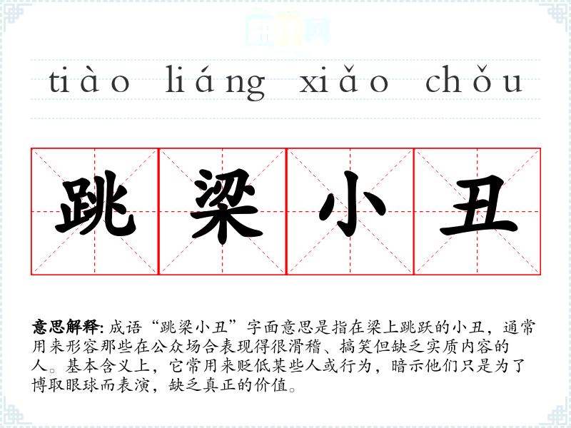 成语“跳梁小丑”字面意思是指在梁上跳跃的小丑,通常用来形容那些在公众场合表现得很滑稽、搞笑但缺乏实质内容的人。基本含义上,它常用来贬低某些人或行为,暗示他们只是为了博取眼球而表演,缺乏真正的价值。