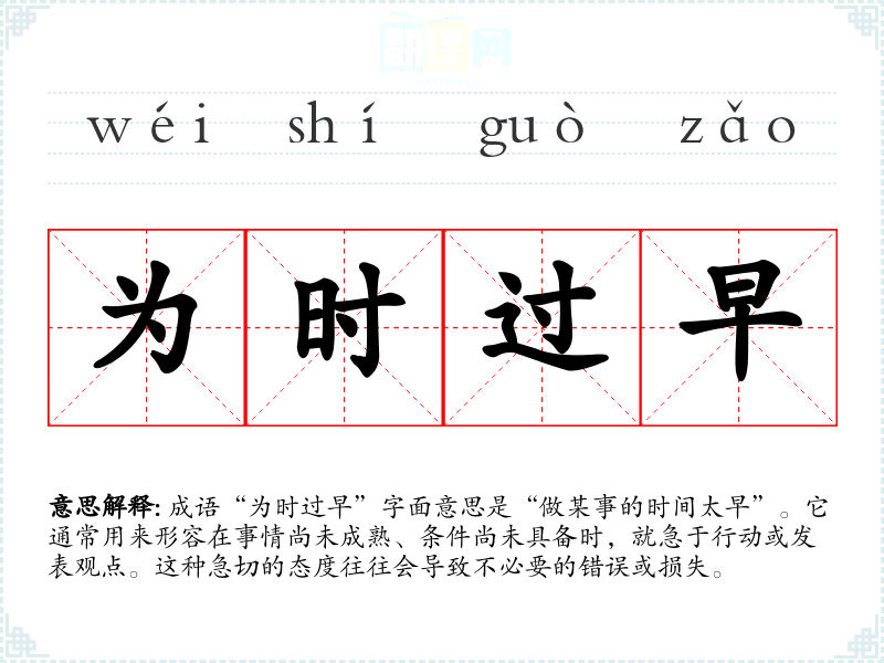 成语“为时过早”字面意思是“做某事的时间太早”。它通常用来形容在事情尚未成熟、条件尚未具备时,就急于行动或发表观点。这种急切的态度往往会导致不必要的错误或损失。