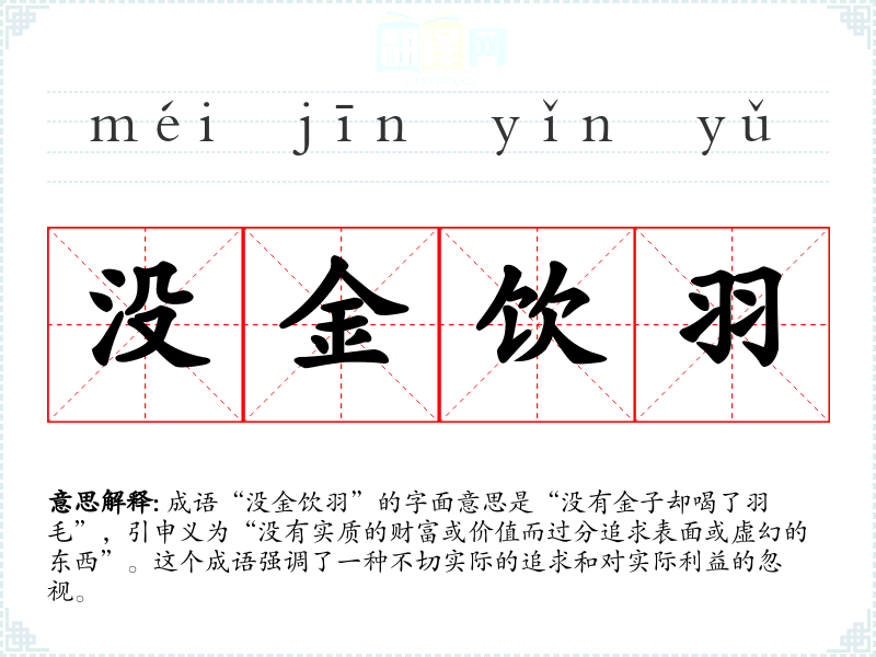 成语“没金饮羽”的字面意思是“没有金子却喝了羽毛”,引申义为“没有实质的财富或价值而过分追求表面或虚幻的东西”。这个成语强调了一种不切实际的追求和对实际利益的忽视。
