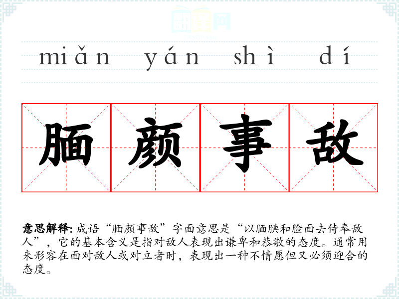 成语“腼颜事敌”字面意思是“以腼腆和脸面去侍奉敌人”,它的基本含义是指对敌人表现出谦卑和恭敬的态度。通常用来形容在面对敌人或对立者时,表现出一种不情愿但又必须迎合的态度。