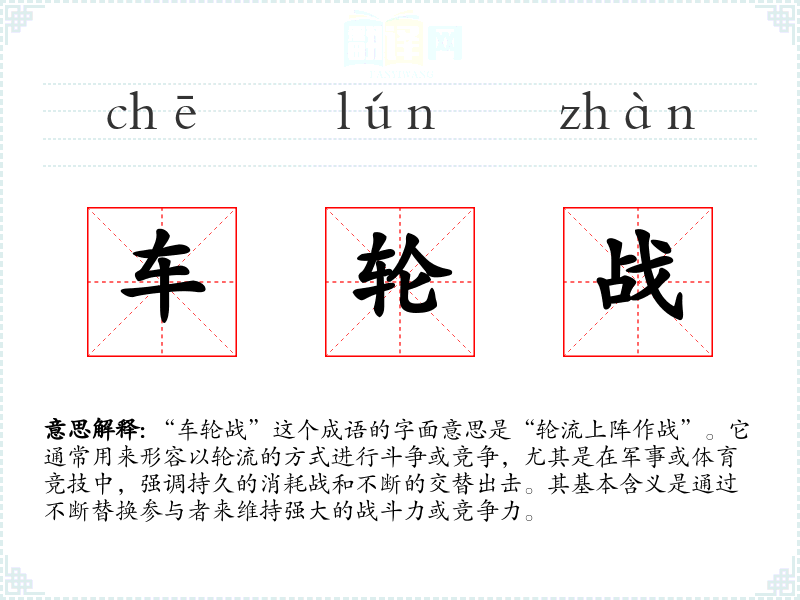 “车轮战”这个成语的字面意思是“轮流上阵作战”。它通常用来形容以轮流的方式进行斗争或竞争,尤其是在军事或体育竞技中,强调持久的消耗战和不断的交替出击。其基本含义是通过不断替换参与者来维持强大的战斗力或竞争力。
