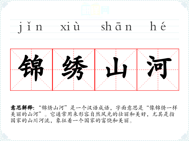 “锦绣山河”是一个汉语成语,字面意思是“像锦绣一样美丽的山河”。它通常用来形容自然风光的壮丽和美好,尤其是指国家的山川河流,象征着一个国家的富饶和美丽。