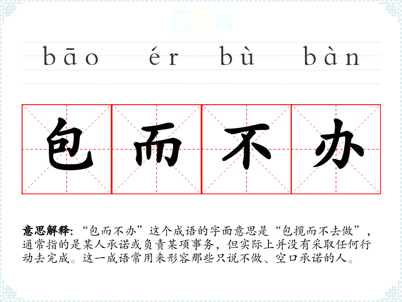 “包而不办”这个成语的字面意思是“包揽而不去做”,通常指的是某人承诺或负责某项事务,但实际上并没有采取任何行动去完成。这一成语常用来形容那些只说不做、空口承诺的人。