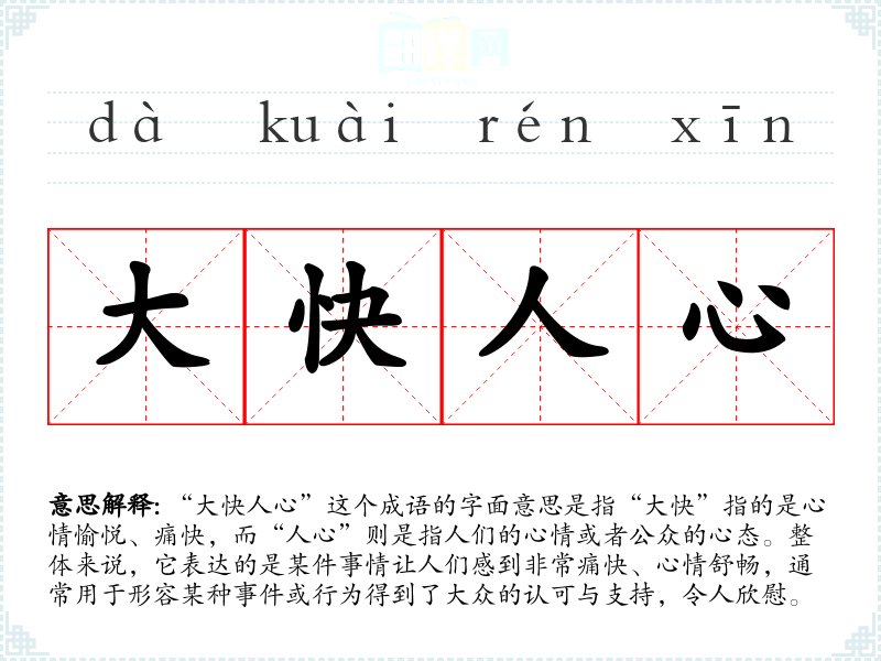 “大快人心”给人一种畅快淋漓、痛快的感觉,通常与正义、胜利、满足等情感相联系。它可以激发人们的积极情绪,特别是在面对不公现象得到纠正时,令人倍感振奋。