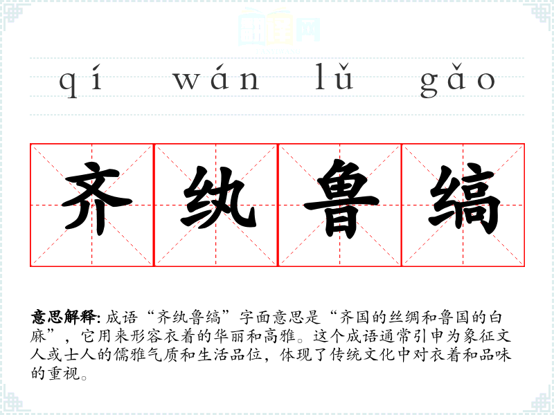 “齐纨鲁缟”源于《论语·卫灵公》,原文为“君子之德,风;小人之德,草。草上之风,必振;故君子之德,必振。”其中提到“齐纨”和“鲁缟”,反映了春秋时期齐国和鲁国的文化差异与风尚。齐国以其奢华的丝绸闻名,而鲁国则以其朴素的麻布著称。因此,这个成语在文化和历史上有着深厚的背景。