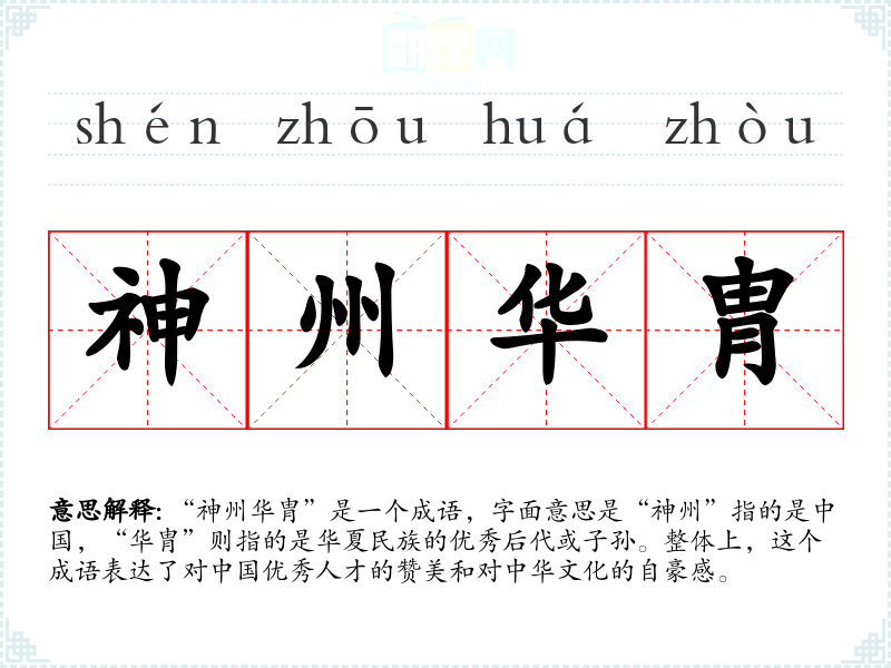 “神州华胄”是一个成语,字面意思是“神州”指的是,“华胄”则指的是华夏民族的优秀后代或子孙。整体上,这个成语表达了对优秀人才的赞美和对中华文化的自豪感。