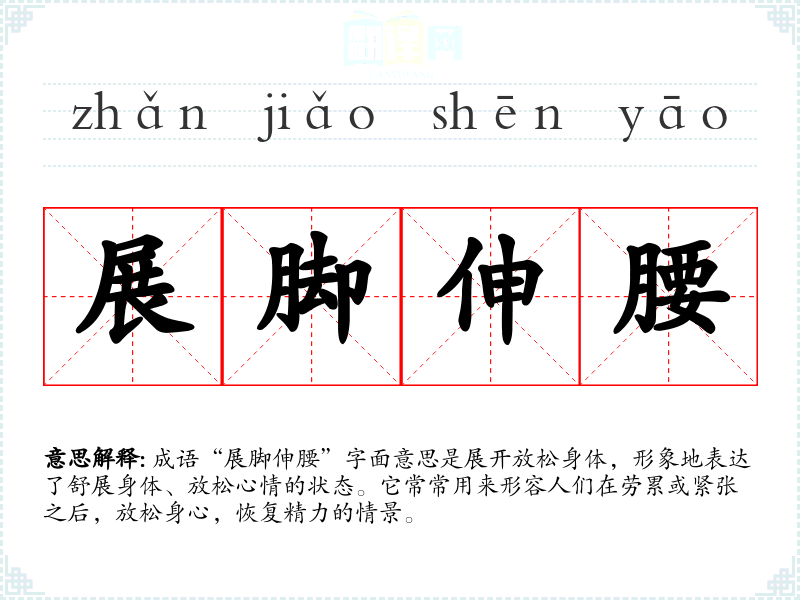 “展脚伸腰”并没有特定的历史背景或典故,但可以理解为一种生活常态的描述,它反映了人们日常生活中的一种自然行为。在古代文人或普通百姓的生活中,经过长时间的劳作或学习后,都会有这样的行为,因而这一成语自然流传开来。