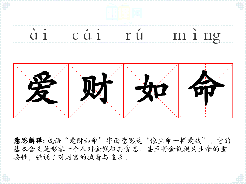成语“爱财如命”字面意思是“像生命一样爱钱”。它的基本含义是形容一个人对金钱极其贪恋,甚至将金钱视为生命的重要性,强调了对财富的执着与追求。