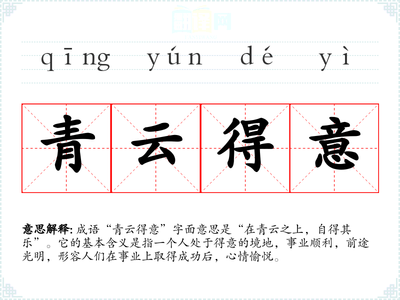 成语“青云得意”字面意思是“在青云之上,自得其乐”。它的基本含义是指一个人处于得意的境地,事业顺利,前途光明,形容人们在事业上取得成功后,心情愉悦。