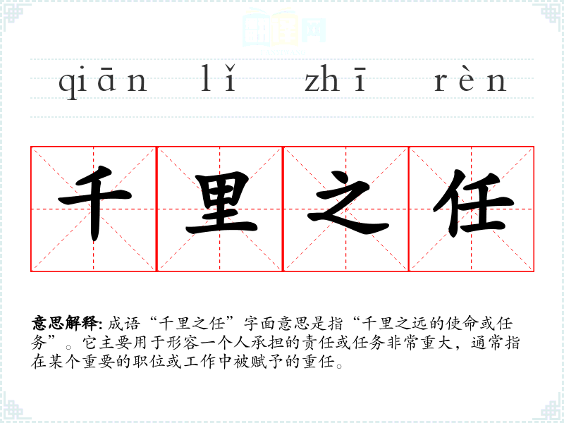 成语“千里之任”字面意思是指“千里之远的使命或任务”。它主要用于形容一个人承担的责任或任务非常重大,通常指在某个重要的职位或工作中被赋予的重任。