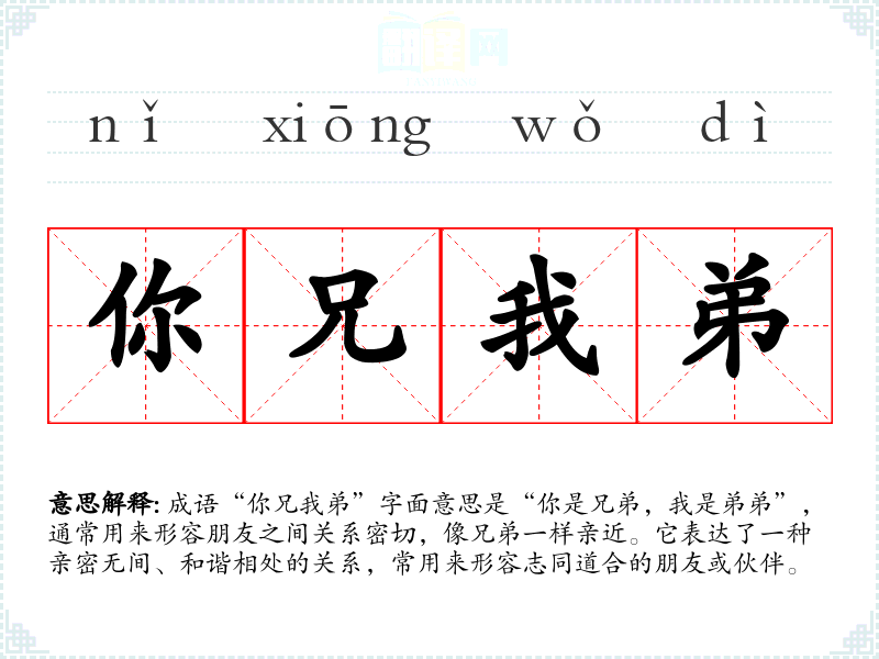 成语“你兄我弟”字面意思是“你是兄弟,我是弟弟”,通常用来形容朋友之间关系密切,像兄弟一样亲近。它表达了一种亲密无间、和谐相处的关系,常用来形容志同道合的朋友或伙伴。
