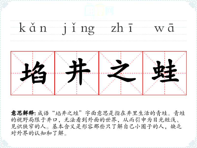 成语“埳井之蛙”字面意思是指在井里生活的青蛙。青蛙的视野局限于井口,无法看到外面的世界,从而引申为目光短浅、见识狭窄的人。基本含义是形容那些只了解自己小圈子的人,缺乏对外界的认知和了解。