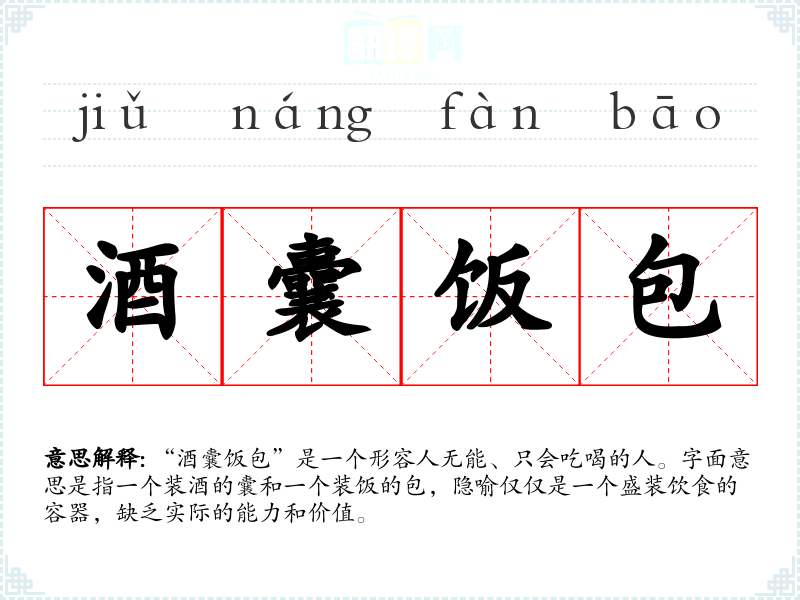 “酒囊饭包”是一个形容人无能、只会吃喝的人。字面意思是指一个装酒的囊和一个装饭的包,隐喻仅仅是一个盛装饮食的容器,缺乏实际的能力和价值。