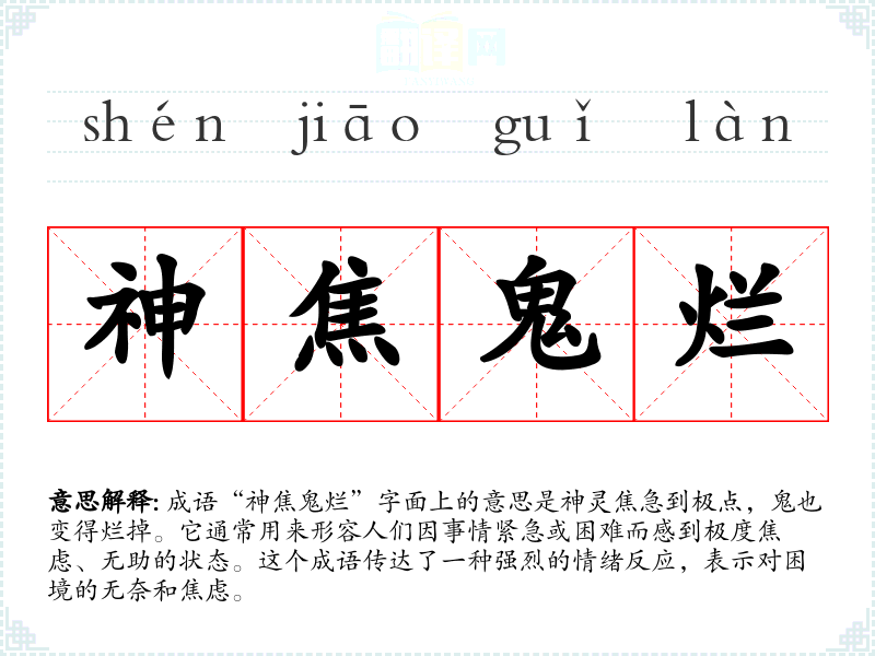 成语“神焦鬼烂”字面上的意思是神灵焦急到极点,鬼也变得烂掉。它通常用来形容人们因事情紧急或困难而感到极度焦虑、无助的状态。这个成语传达了一种强烈的情绪反应,表示对困境的无奈和焦虑。
