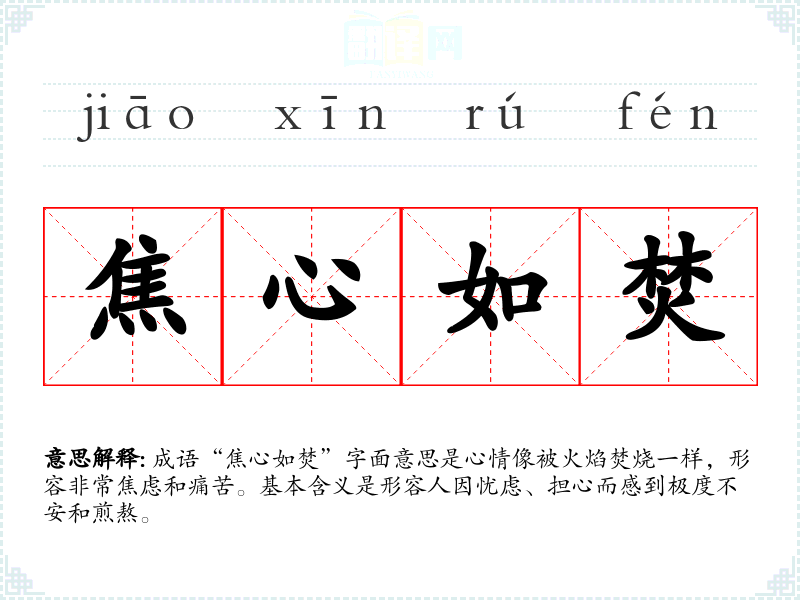 成语“焦心如焚”字面意思是心情像被火焰焚烧一样,形容非常焦虑和痛苦。基本含义是形容人因忧虑、担心而感到极度不安和煎熬。