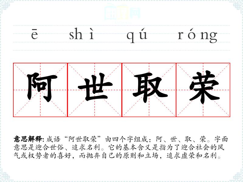 | 阿世取荣 | 指迎合世俗,取悦于人。 |