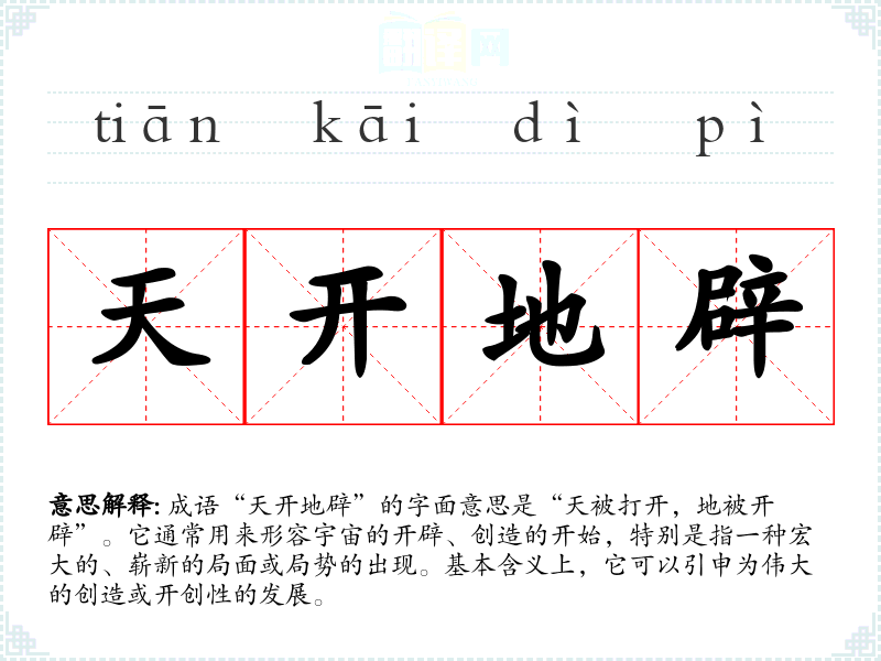 - 开天辟地:与“天开地辟”意思相近,强调创造和开创的伟大。