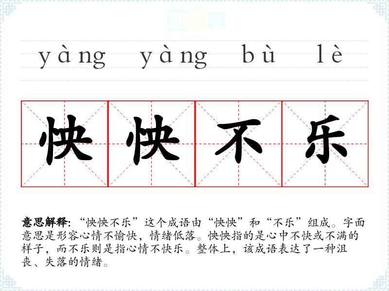 “怏怏不乐”这个成语由“怏怏”和“不乐”组成。字面意思是形容心情不愉快,情绪低落。怏怏指的是心中不快或不满的样子,而不乐则是指心情不快乐。整体上,该成语表达了一种沮丧、失落的情绪。