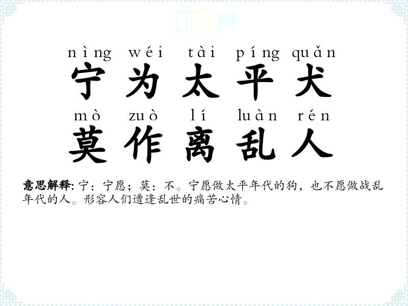 宁:宁愿;莫:不。宁愿做太平年代的狗,也不愿做战乱年代的人。形容人们遭逢乱世的痛苦心情。 |