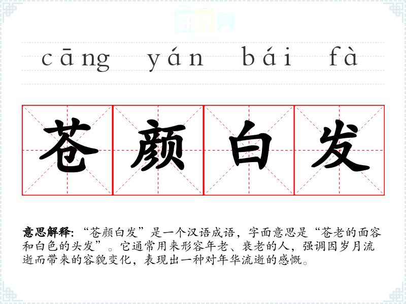 “苍颜白发”是一个汉语成语,字面意思是“苍老的面容和白色的头发”。它通常用来形容年老、衰老的人,强调因岁月流逝而带来的容貌变化,表现出一种对年华流逝的感慨。
