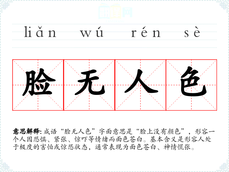 成语“脸无人色”字面意思是“脸上没有颜色”,形容一个人因恐惧、紧张、惊吓等情绪而面色苍白。基本含义是形容人处于极度的害怕或惊恐状态,通常表现为面色苍白、神情慌张。