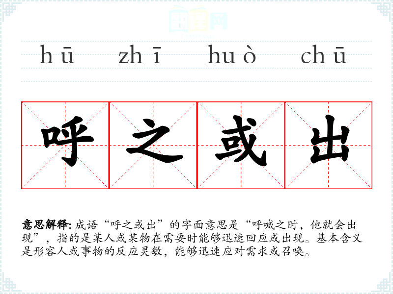 成语“呼之或出”的字面意思是“呼喊之时,他就会出现”,指的是某人或某物在需要时能够迅速回应或出现。基本含义是形容人或事物的反应灵敏,能够迅速应对需求或召唤。