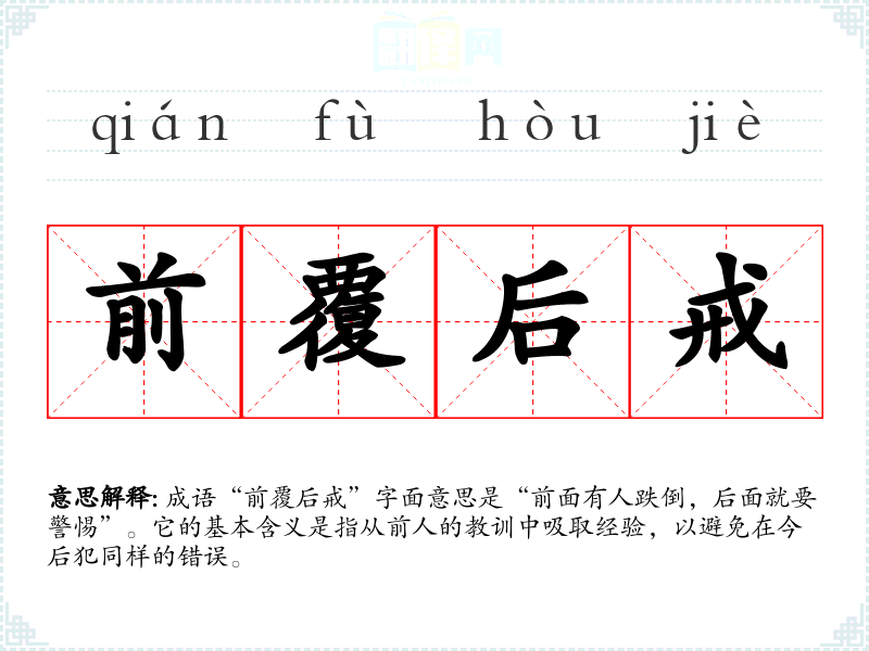 成语“前覆后戒”字面意思是“前面有人跌倒,后面就要警惕”。它的基本含义是指从前人的教训中吸取经验,以避免在今后犯同样的错误。