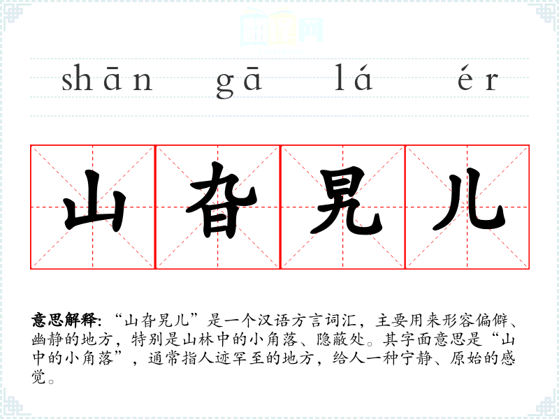 “山旮旯儿”是一个汉语方言词汇,主要用来形容偏僻、幽静的地方,特别是山林中的小角落、隐蔽处。其字面意思是“山中的小角落”,通常指人迹罕至的地方,给人一种宁静、原始的感觉。
